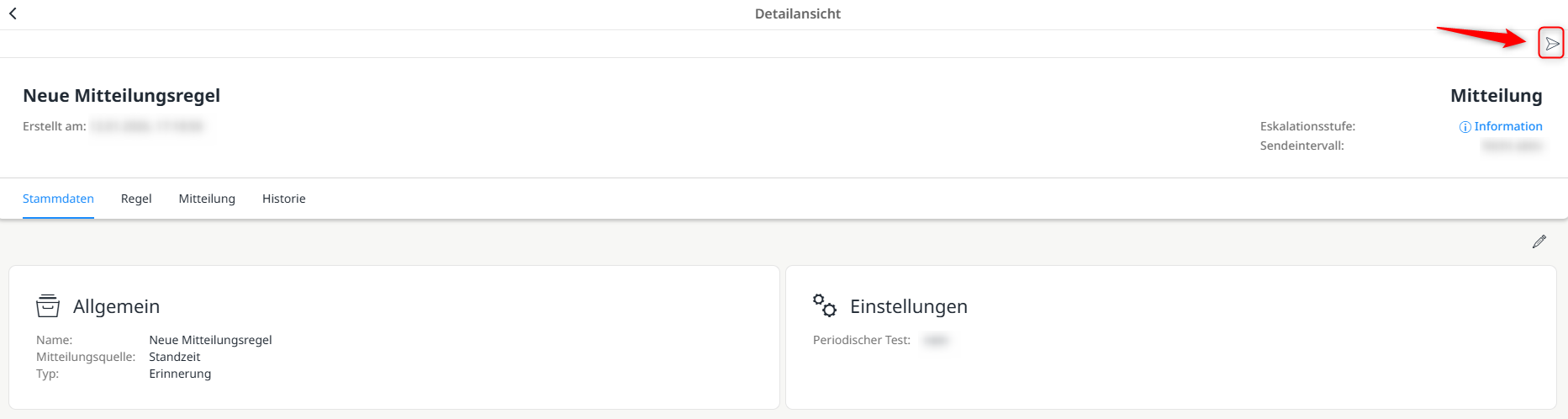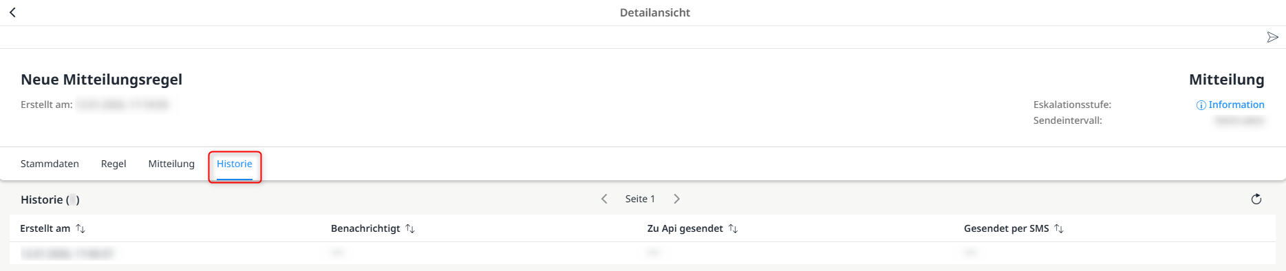 Alle ausgelösten Mitteilungen können Sie in der Historie innerhalb der Detailansicht einer Mitteilungsregel einsehen.