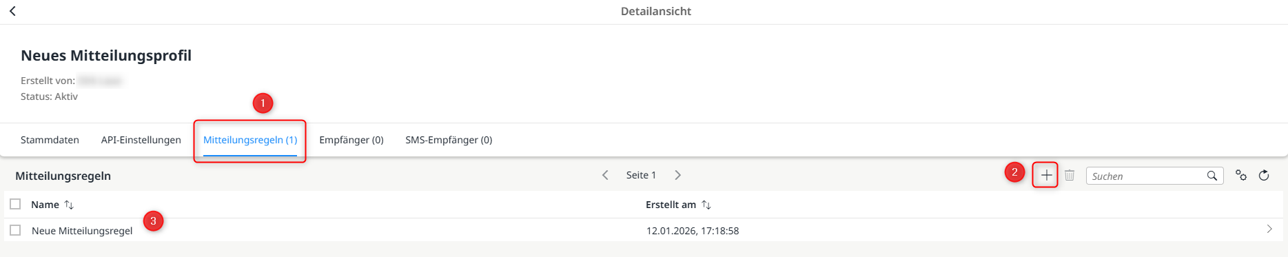 - Wählen Sie in der Detailansicht des Mitteilungsprofils den Reiter Mitteilungsregeln aus.