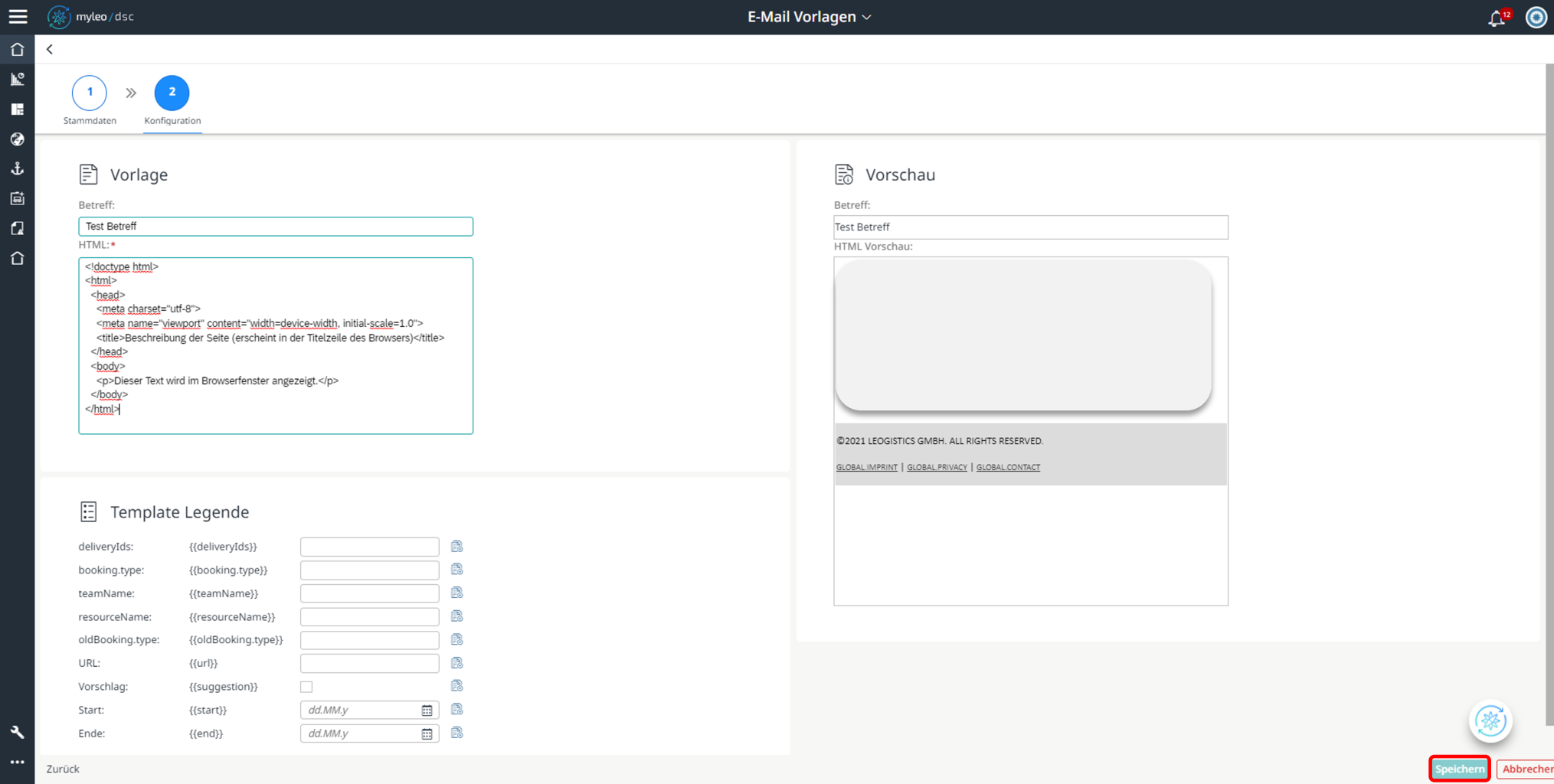 Mit einem Klick auf Speichern wird die E-Mail Vorlage erstellt.