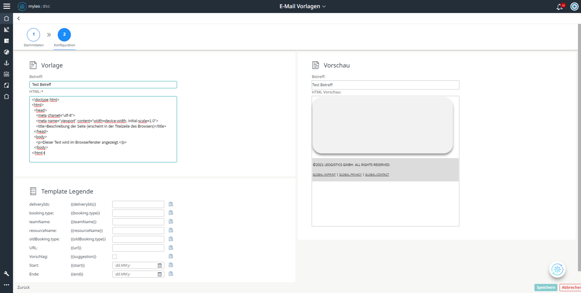 Im Bereich Konfiguration wird in der Vorlage der Betreff und Text-Körper der E-Mail in HTML eingetragen. Auf der rechten Seite wird eine HTML Vorschau bspw. des Kunden Logos angezeigt.