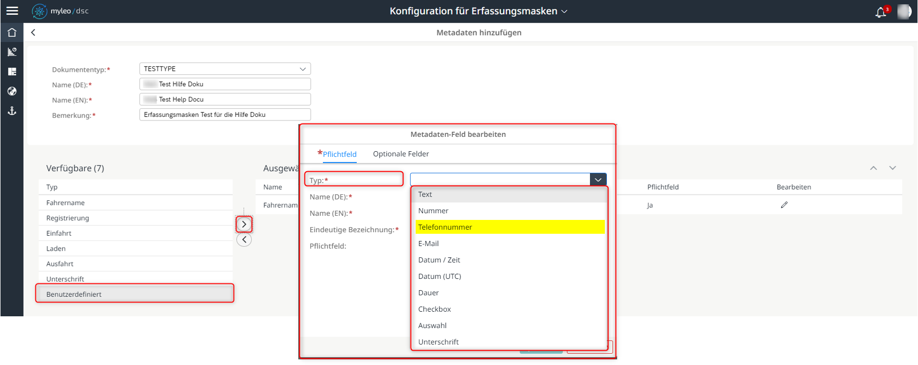 Wählen Sie bei Verfügbare Benutzerdefiniert und klicken Sie auf den Pfeil Button. Im Metadaten-Feld bearbeiten Fenster wählen Sie bei Typ Telefonnummer aus.