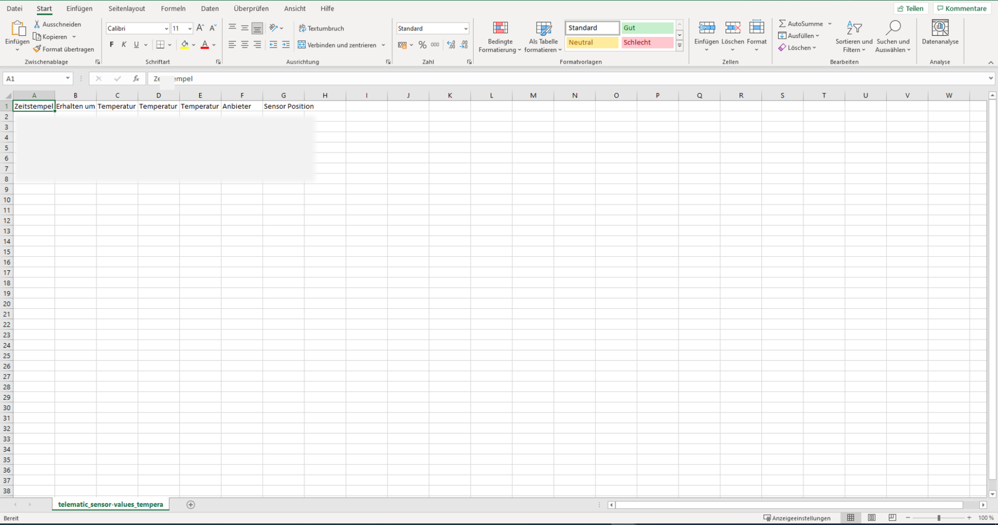 Der Nutzer öffnet die Datei in Excel, woraufhin ihm dieselben Reiter, wie aus dem Tab Temperatur angezeigt werden. In diesem Fall die Reiter Zeitstempel, Erhalten um, Temperatur (°C), Temperatur (°F), Anbieter und Sensor Position.
