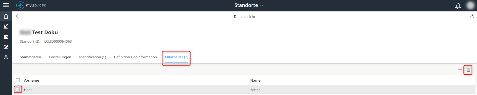 Falls eine Mitarbeiterzuweisung zu einem Standort nicht mehr benötigt wird, können Sie diese über den Mülleimersymbol Button löschen. Wählen Sie zuerst den Mitarbeiter, der gelöscht werden soll durch Setzen eines Hakens aus. Der Mülleimersymbol Button wird dann aktiv gesetzt und mit einem Klick darauf können Sie den Mitarbeit vom Standort entfernen.
