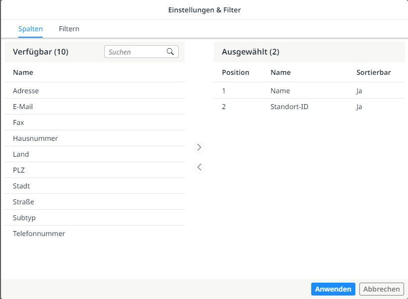 können Sie im Reiter Spalten die anzuzeigenden Felder für die Tabellenansicht bestimmen: