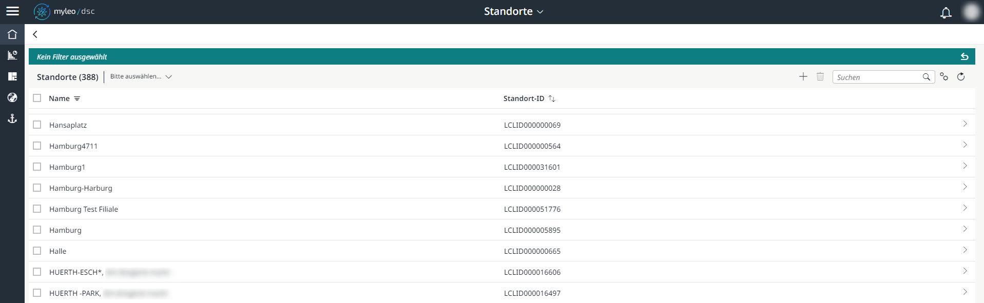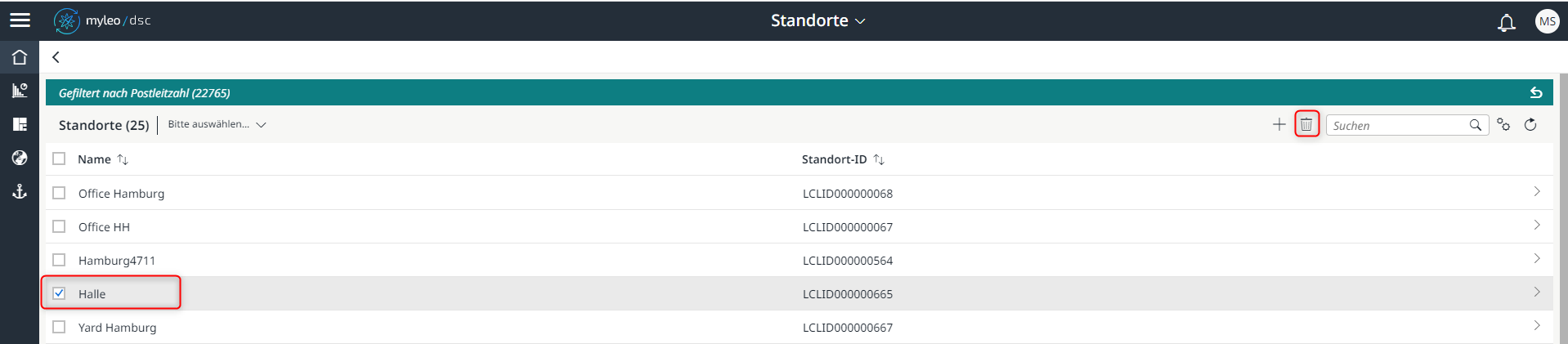 Falls ein Standort nicht mehr benötigt wird, können Sie diesen über den Mülleimersymbol Button löschen. Wählen Sie zuerst den Standort, der gelöscht werden soll durch Setzen eines Hakens aus. Der Mülleimersymbol Button wird dann aktiv gesetzt und mit einem Klick darauf können Sie den Standort entfernen.