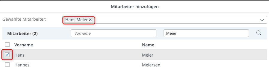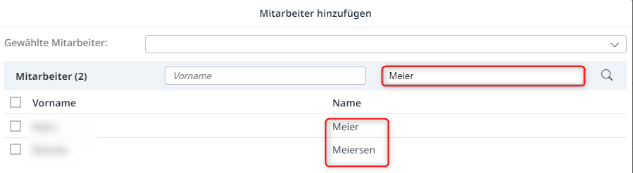 Falls - wie im Screenshot oben gezeigt - mehr als 100 Mitarbeitereinträge zur Verfügung stehen - können Sie die Suche in den Feldern mit dem Lupensymbol Button benutzen um die Mitarbeiter gezielt auswählen zu können. Sie können nach Vorname und nach Nachname suchen und auch nach einer Kombination.