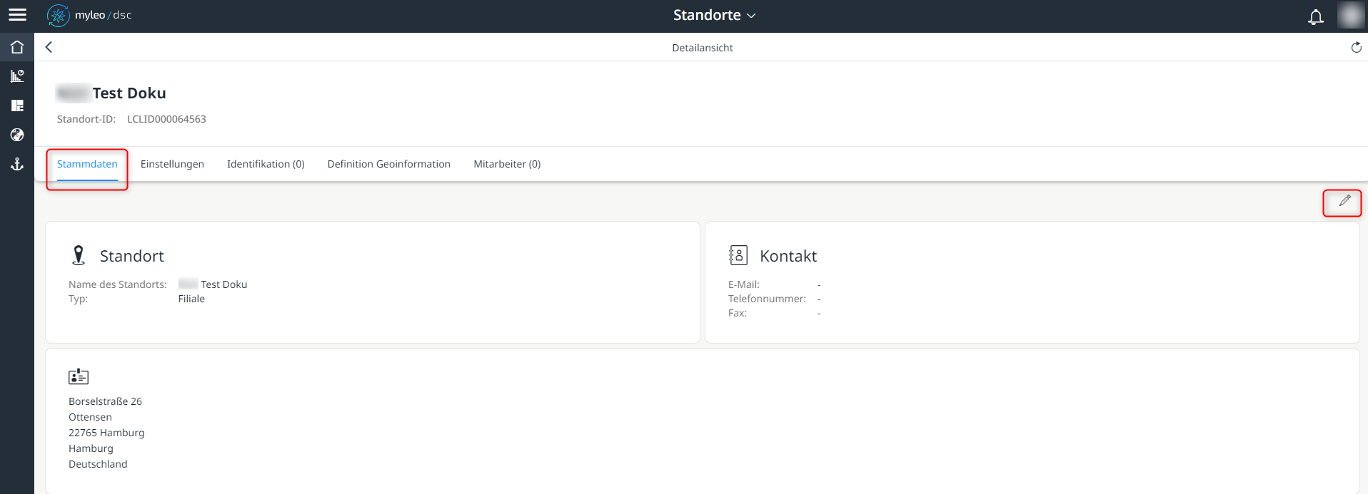 Im ersten Reiter Stammdaten können Sie die hinterlegte Adresse mit den Kontaktdaten über den Stiftsymbol Button bearbeiten und pflegen.
