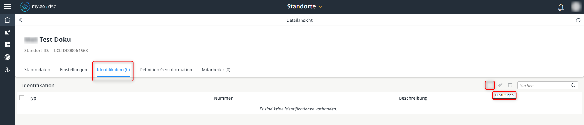 Im Reiter Identifikation können Sie eine oder mehrere Identifikationen für den Standort hinzufügen. Sie müssen für das Pflichtfeld Typ einen Eintrag aus der Dropdownliste auswählen und für das Pflichtfeld Identifikationsnummer einen Eintrag vornehmen. Eine Beschreibung können Sie hinzufügen. Sobald die Pflichtfelder befüllt sind, wird der Anlegen Button aktiv gesetzt. Nach Klick auf den Anlegen Button wird die Identifikation angelegt und kann danach noch mit dem Stiftsymbol Button bearbeitet und mit dem Mülleimersymbol Button wieder gelöscht werden.