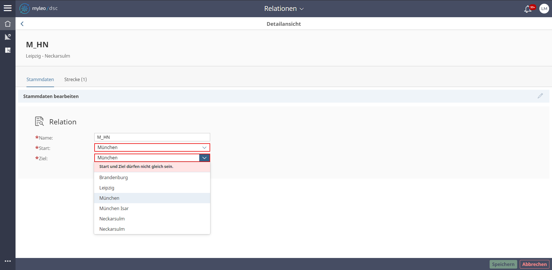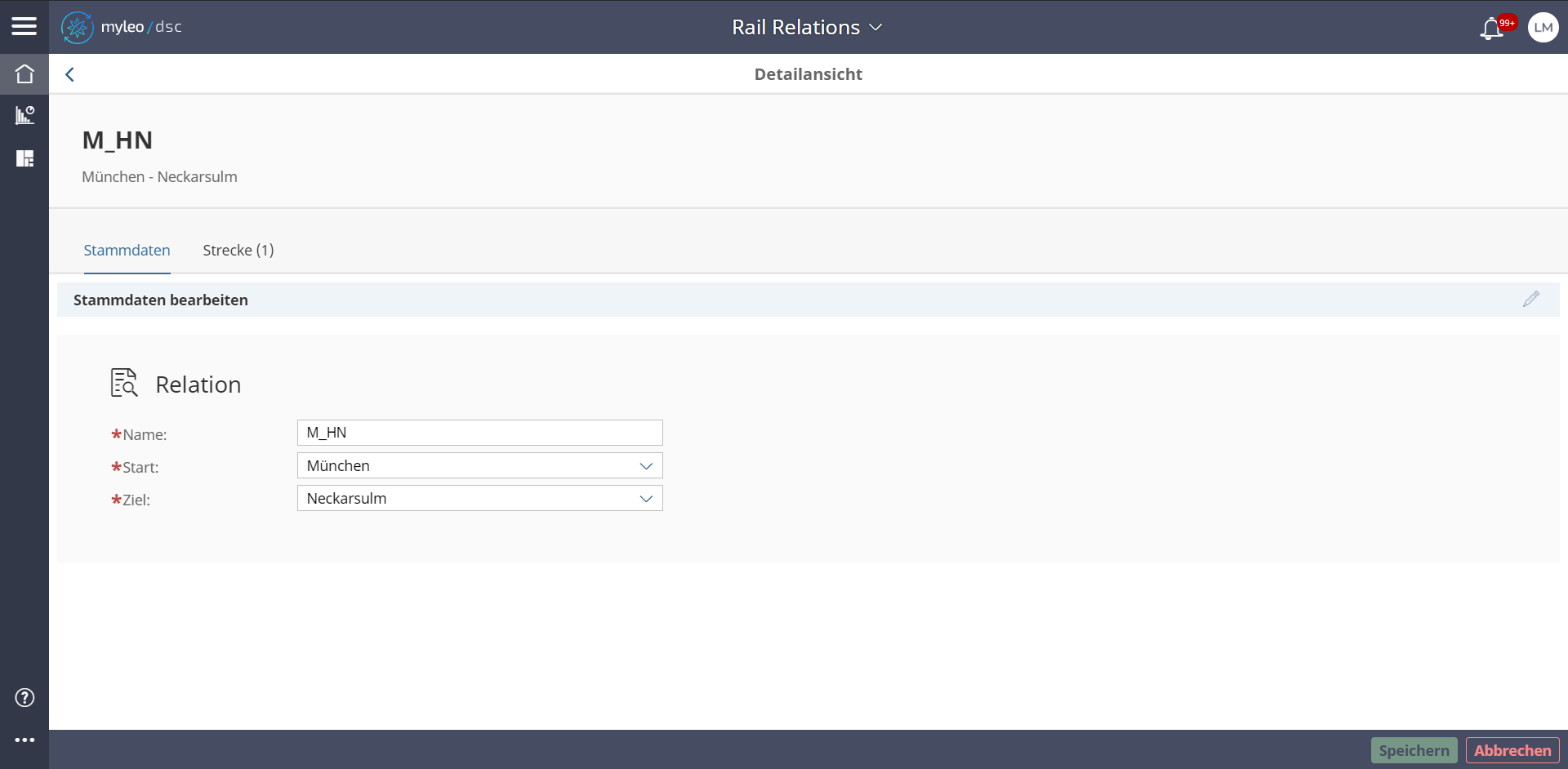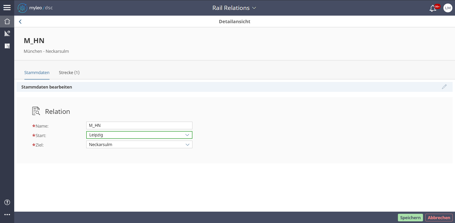 - Im Reiter Stammdaten können Änderungen an dem Namen der Relation, sowie dem Start und dem Ziel vorgenommen werden.