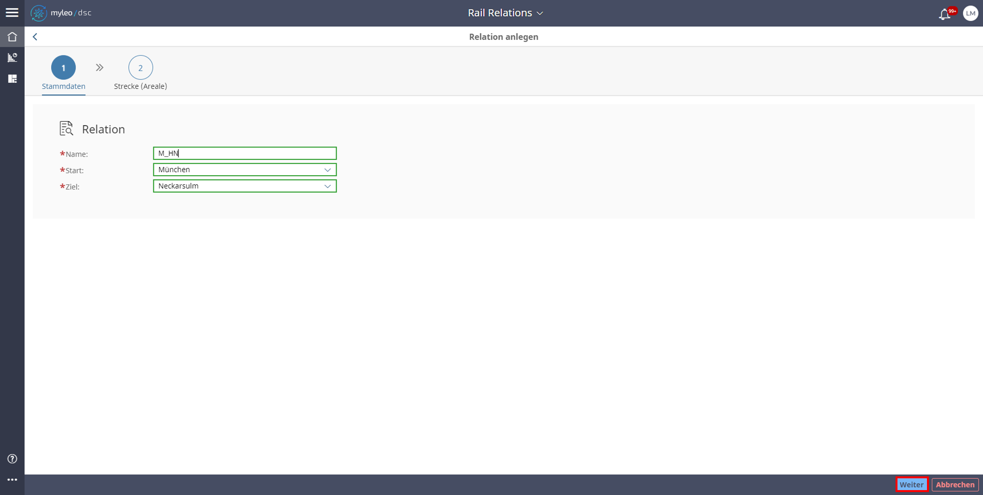 - Reiter Stammdaten. Eingabe von Name (Name der Relation), Start (Bahn-Areal Kategorie "Standort") und Ziel (Bahn Areal Kategorie "Standort") der Relation.