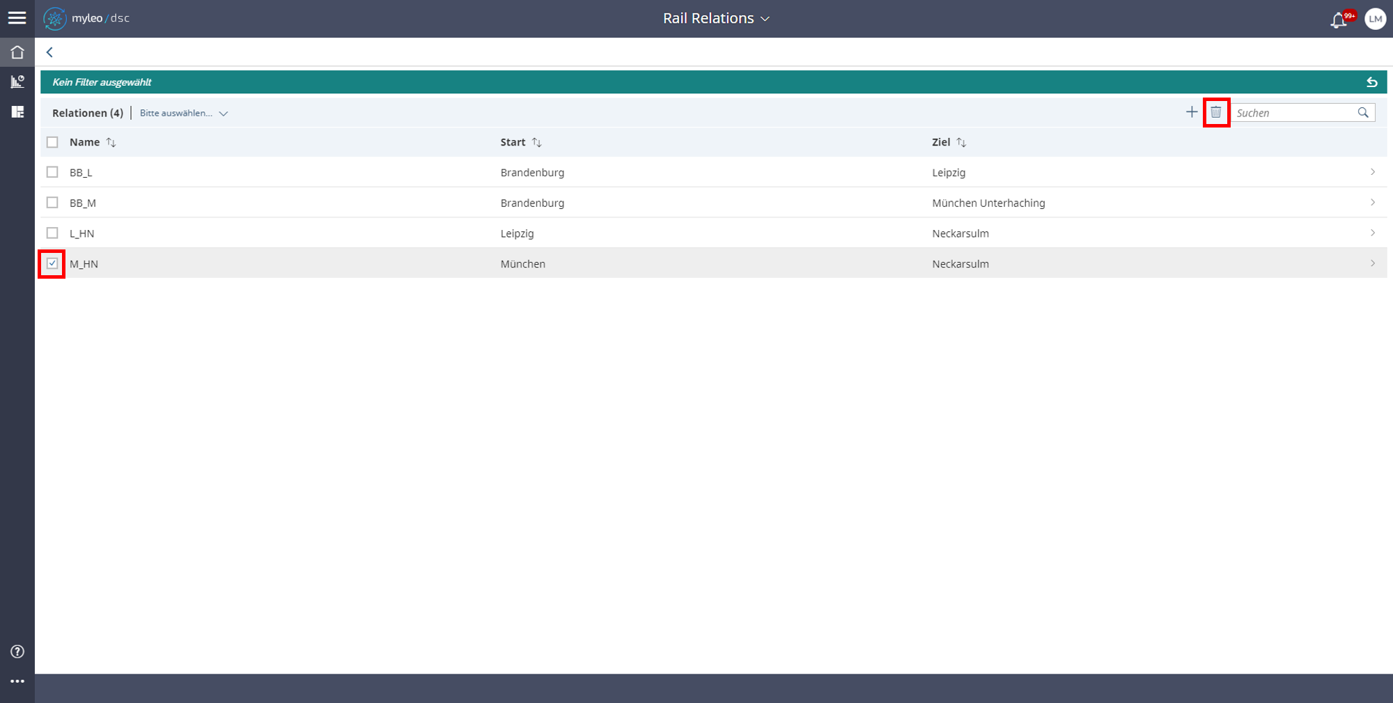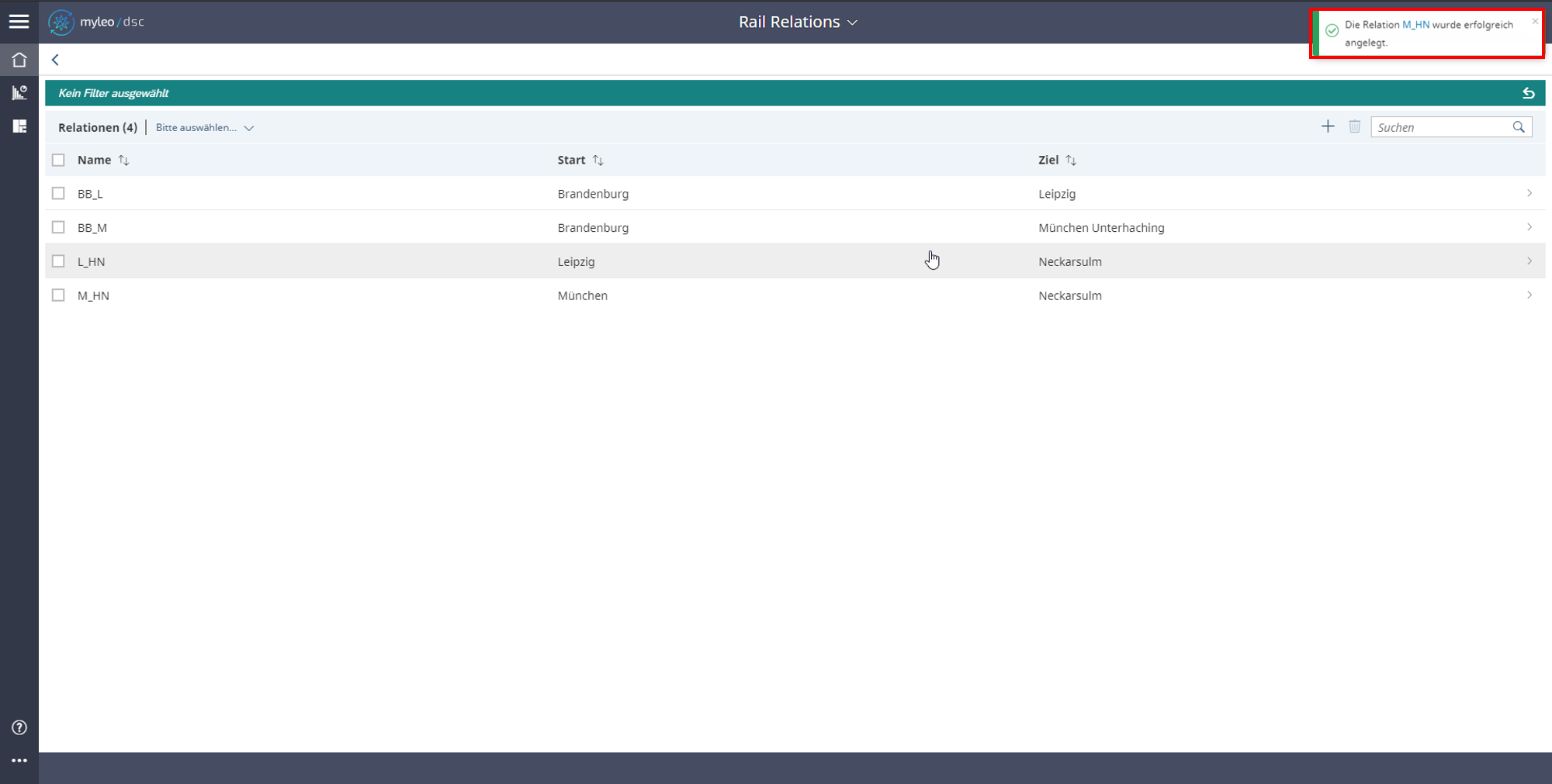 Die Relation wird nach dem Löschen nicht mehr in der Worklist angezeigt. Es erscheint die Meldung, dass eine Relation erfolgreich gelöscht wurde.