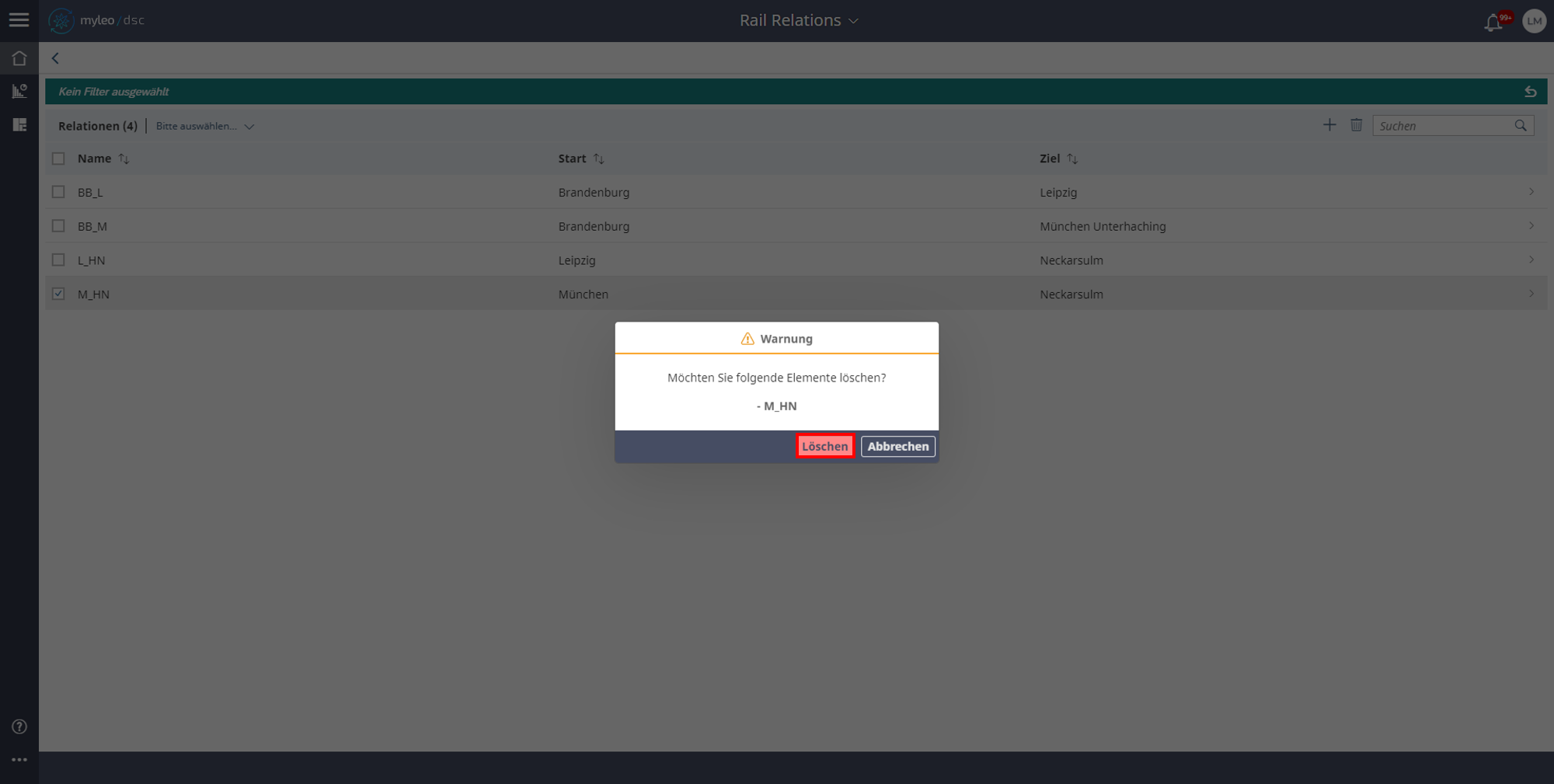 - Um die Relation final zu löschen, erscheint eine Warnung im PopUp. Diese Aktion wird mit der Auswahl des Buttons bestätigt.