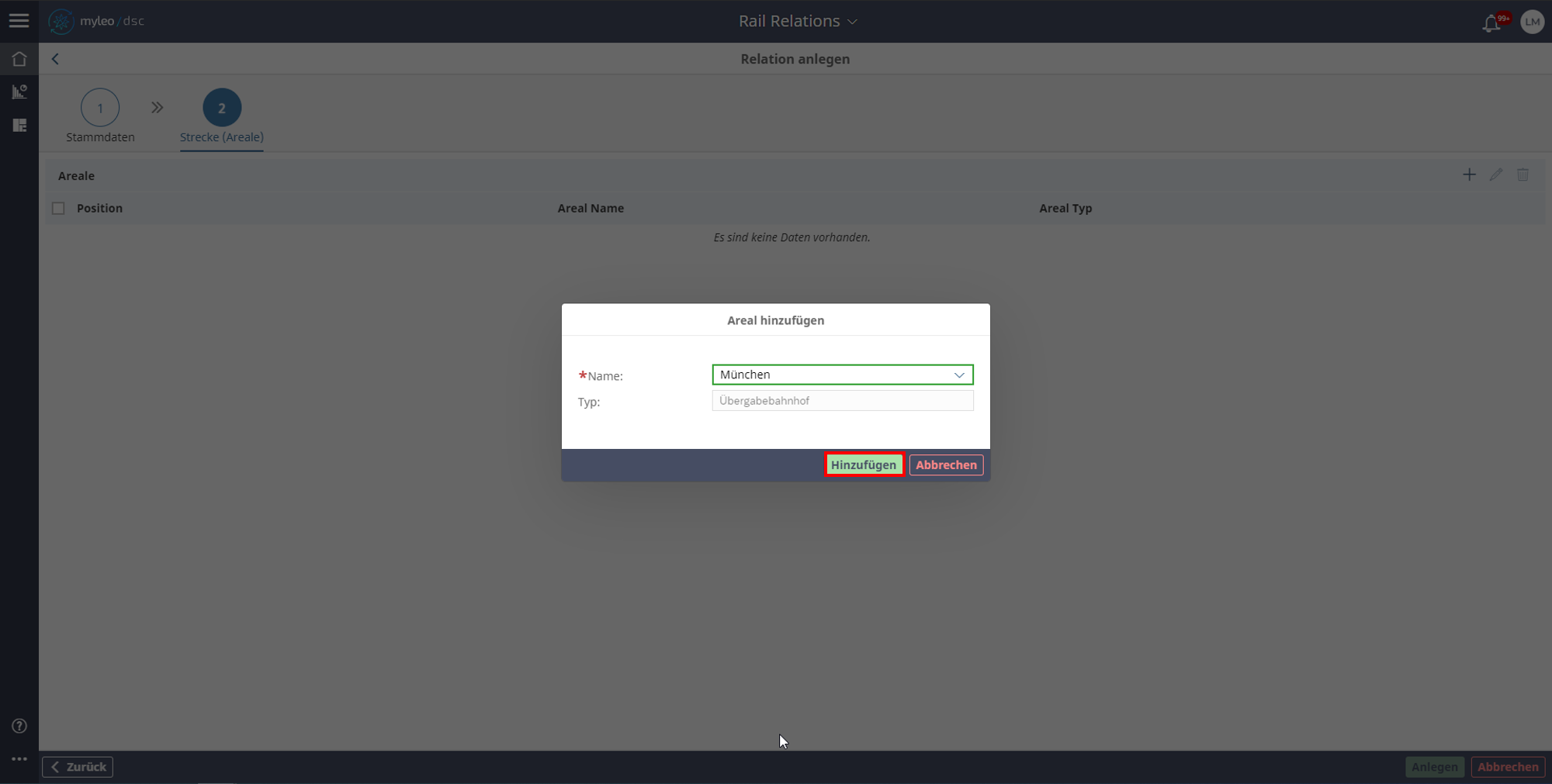 Reiter Strecke (Areale). In dieser Ansicht werden Areale (Bahn-Areal Kategorie "Übergabebahnhof", "Vorbahnhof", "Bahnstelle") hinzugefügt, an deren Sequenz-Folge die Relation erkannt werden soll.