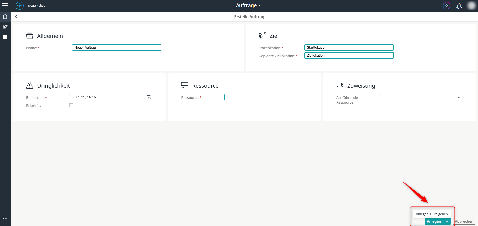 Einen Auftrag anlegen und gleichzeitig freigeben