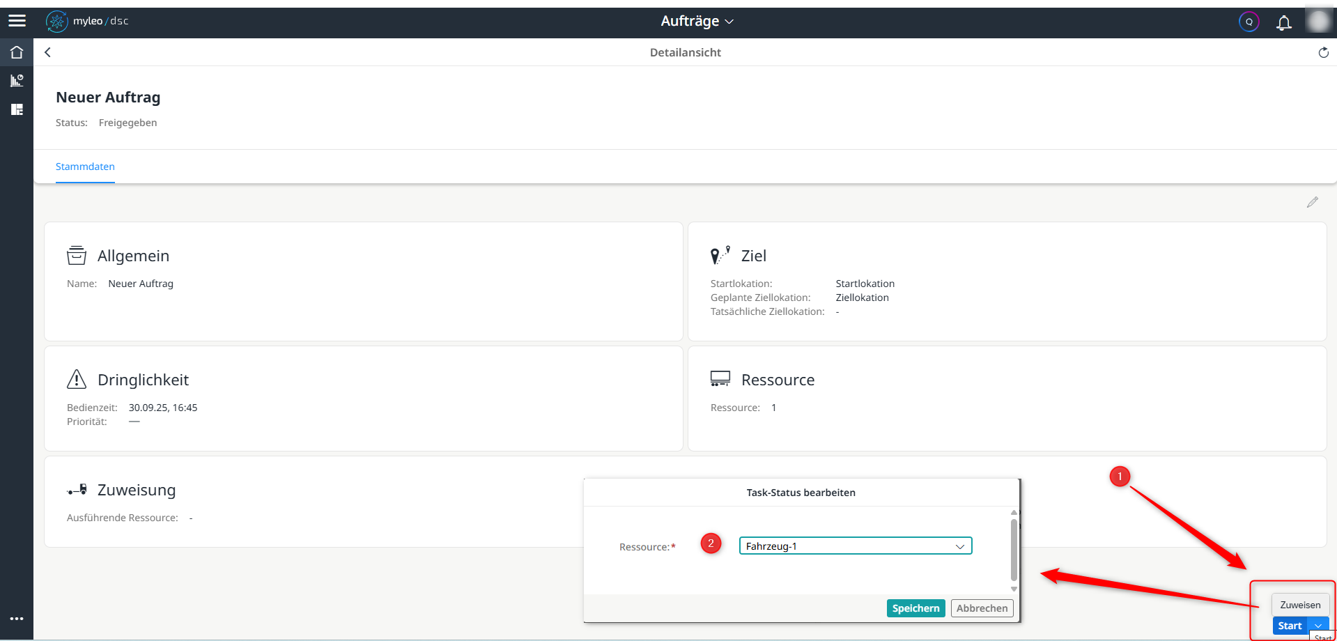 - In der Detailansicht des Auftrages öffnet sich nach der Auswahl des Start-Buttons die Auswahl Zuweisen